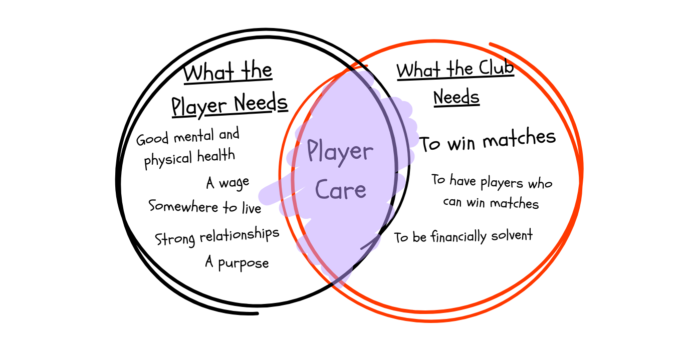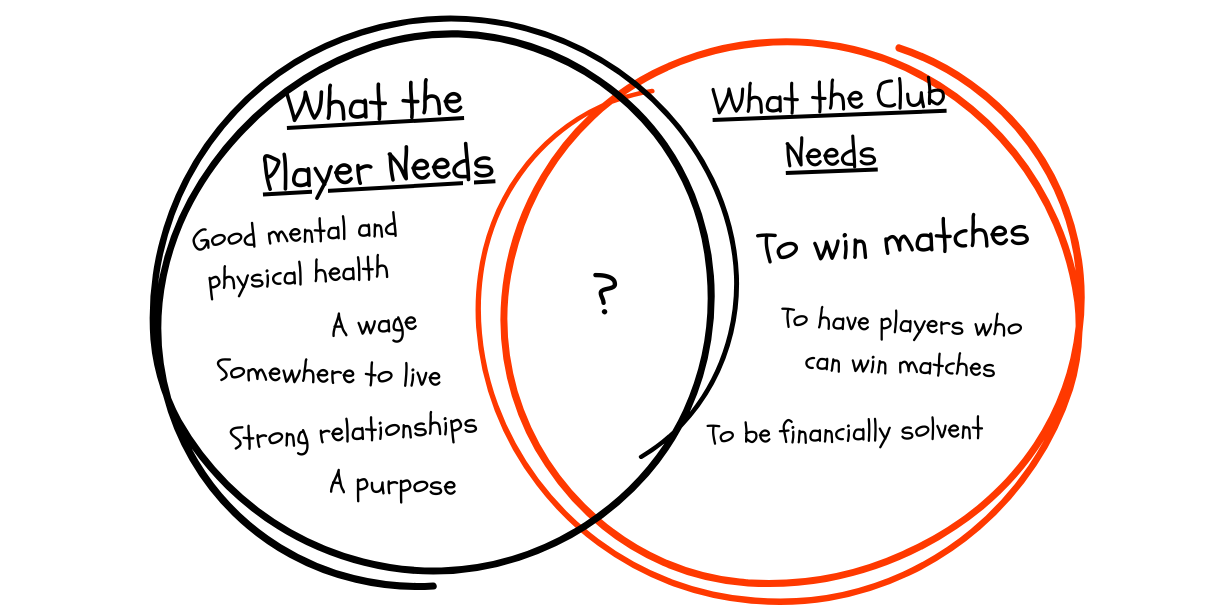 This ‘Needs Venn Diagram’ helps to demystify one of the fallacies that exist in professional football. That clubs truly care for their players. If you think that, forget it. I am here to tell you that they don’t. Or, more accurately, football clubs will care for players as long as they can help them fulfil their needs. Remember, players are only useful to clubs if they are helping them achieve their need - to win football matches. This is why any care for the player as a person, their well-being and their welfare sits at the bottom of the ‘to-do’ list of a club.